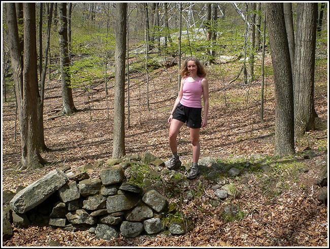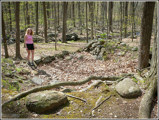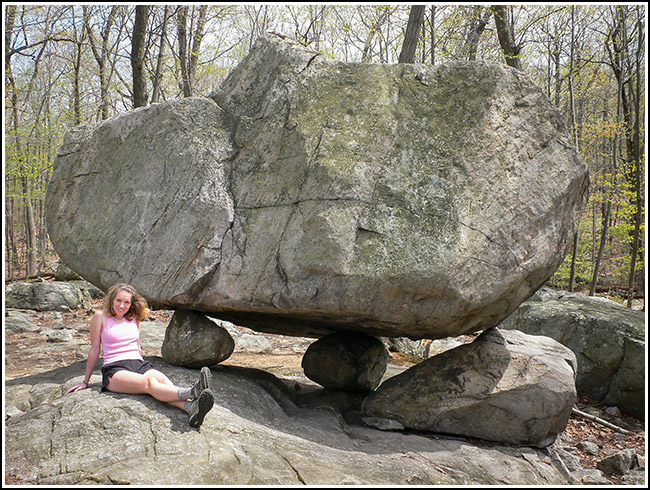 Standing alone in the woods at the edge of a large swamp, Bear Rock has been used as a boundary marker for at least 200 years. Even today it marks the borders of the Kinnelon and Montville boroughs. Although it is difficult and even dangerous to scale, there are some very old surveying markers found near its highest points.