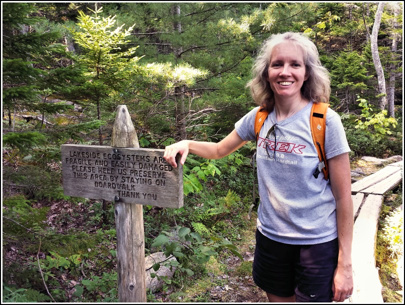 Hot, sunny day, awesome weather and relaxing activities! Started off with pastries (sticky and blueberry cheese danish, plain tea [where is the Earl Grey?!] and coffee) but ate at the benchmark bench rather than the gazebo because a man was “arting” there. Seriously, “making art” (drawing), not a euphemism for farting. We had a great time at the pier talking for two hours just enjoying each other’s company and watching the cruisers stroll by in their uniform: capri pants, floral print handbag usually worn across the body, “walking” shoes or sandals. I think it was the Veendam, you know, one of those DAM ships. There weren’t too many buses lined up at the pier, and they didn’t significantly impact the crowds in town as they have in the past. Because R’s foot was hurting due to something he did yesterday, which we still haven’t figured out, we decided to make it a relatively easy day and leave our plans to hike Sargent or the Potholes trail again for another day. Our initial thought was to use the bus system to get to Day Mountain, but we didn’t see a very efficient way to do it, so we decided to just do the Jordan Pond loop again, but approach it via the Goat Trail from the Park Loop Road. The bus driver was willing to let us off at the parking pulloff just south of the new Bubble Rock parking area. We found the trail easily (you really can’t miss the handrail once you know it’s there!) and hiked the stone steps down to emerge (pop out!) onto the Jordan Pond Shore Trail. We noticed that this year, there was not a single piece of flagging tape to be found anywhere along the Goat Trail, while last year the entire route was flagged. I wonder how long it lasted, and who ultimately took it down.
